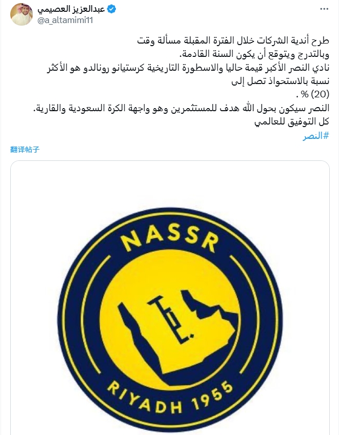 利雅得勝利目前是最有價值的俱樂部,羅納爾多目前的股權(quán)比率最高,達到20。利雅得勝利將成為投資者的焦點,并成為沙特和亞洲足球的外墻。